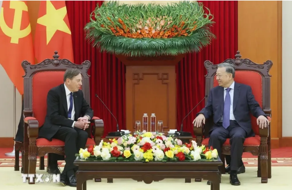 Tổng Bí thư Tô Lâm tiếp Đại tướng David Petraeus. Ảnh: THỐNG NHẤT/TTXVN