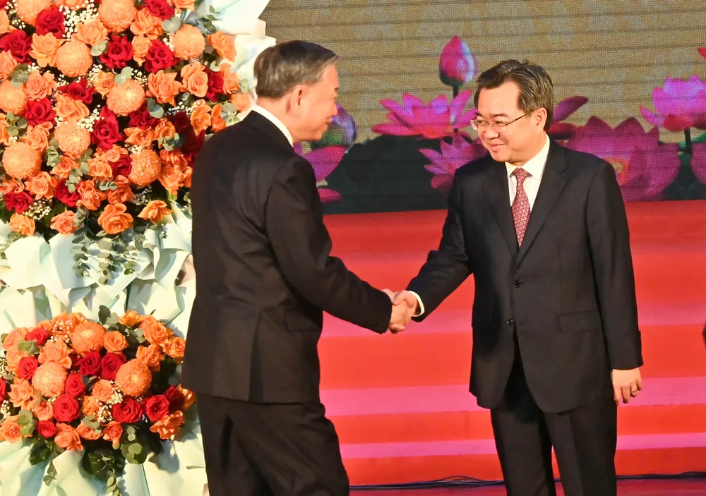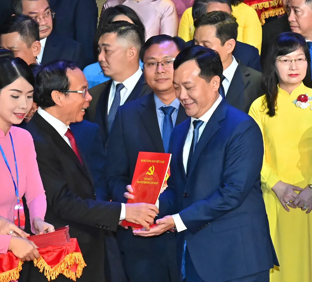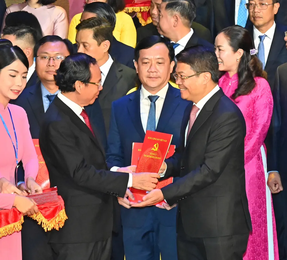 Tổng Bí thư Tô Lâm trao Quyết định của Bộ Chính trị về chỉ định Ban Chấp hành Đảng bộ TPHCM (mới) và Ban Thường vụ Thành ủy TPHCM (mới), nhiệm kỳ 2020-2025. Ảnh: VIỆT DŨNG