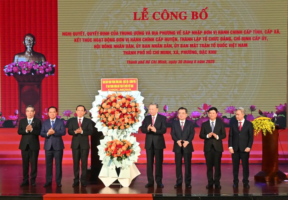 Ngày 30-6, Thành ủy - HĐND - UBND - Ủy ban MTTQ Việt Nam TPHCM tổ chức Lễ công bố các Nghị quyết, Quyết định của Trung ương và địa phương về sáp nhập đơn vị hành chính cấp tỉnh, cấp xã, kết thúc hoạt động đơn vị hành chính cấp huyện, thành lập tổ chức Đảng, chỉ định cấp ủy, HĐND, UBND, Ủy ban MTTQ Việt Nam TPHCM, xã, phường, đặc khu.