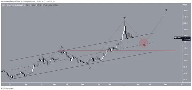 Mức có khả năng cao nhất để đợt điều chỉnh hoàn tất là gần 160 USD (vòng tròn màu đỏ), trùng với đường giữa của kênh tăng dần. Sau khi quá trình điều chỉnh hoàn tất, một chuyển động tăng khác đưa giá QNT lên trên 230 USD có khả năng sẽ xảy ra. Mức cao tiềm năng sẽ thấp hơn 200 USD so với mức cao nhất mọi thời đại