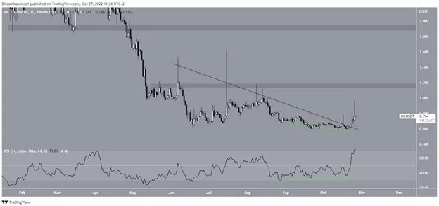 Merit Circle là đồng coin hàng đầu cuối cùng trong số 5 altcoin cần theo dõi vào tháng 11-2022. Giá MC đã giảm bên dưới đường kháng cự giảm dần kể từ ngày 6-6. Sau khi RSI hàng ngày tạo ra sự phân kỳ tăng, giá MC cuối cùng đã bứt phá vào ngày 23-10. Sau đó, nó bắt đầu một chuyển động đi lên rất nhanh nhưng không duy trì được và để lại một bấc dài bên trên.