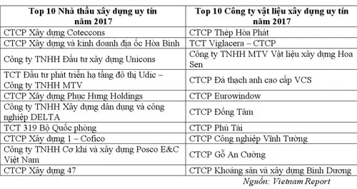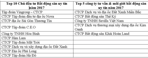 Bên cạnh đó, khảo sát doanh nghiệp về tình hình hoạt động, số lượng dự án, tiến độ triển khai dự án… trong năm 2016 – 2017 cũng được sử dụng như yếu tố bổ sung nhằm xác định vị thế của doanh nghiệp trong ngành. Những công ty có mặt trong các danh sách này đều có năng lực tài chính ổn định, có kinh nghiệm hoạt động trong ngành, thương hiệu được nhiều người tin tưởng và đóng góp tích cực cho sự phát triển chung của toàn ngành bất động sản – xây dựng – vật liệu xây dựng Việt Nam trong thời gian vừa qua.
