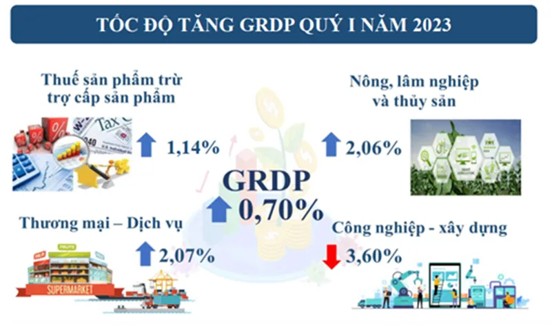 GRDP tăng 0,7% so với cùng kỳ năm 2022, trong đó, khu vực nông lâm thuỷ sản tăng 2,06%; khu vực công nghiệp và xây dựng giảm 3,60% (công nghiệp giảm 0,85%, xây dựng giảm 19,80%); khu vực thương mại dịch vụ tăng 2,07%; thuế sản phẩm tăng 1,14%.