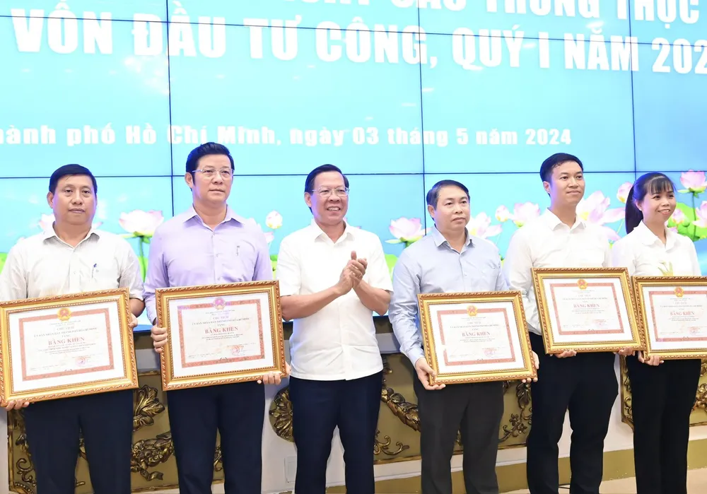 Chủ tịch UBND TPHCM Phan Văn Mãi trao Bằng khen đến các tập thể có thành tích xuất sắc trong giải ngân vốn đầu tư công quý 1. Ảnh: VIỆT DŨNG