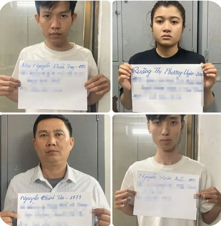 Ngày 24-12, Công an quận 11 (TPHCM) cho biết, đơn vị đã bắt giữ Nguyễn Thành Tân (SN 1979, ngụ huyện Củ Chi), Quãng Thị Phương Uyên (SN 2000, ngụ tỉnh Ninh Thuận), Mai Khánh Duy (SN 1996, ngụ huyện Bình Chánh) và Nguyễn Xuân Bách (SN 1996, ngụ quận Tân Phú) để điều tra về hành vi “Lừa đảo chiếm đoạt tài sản”.