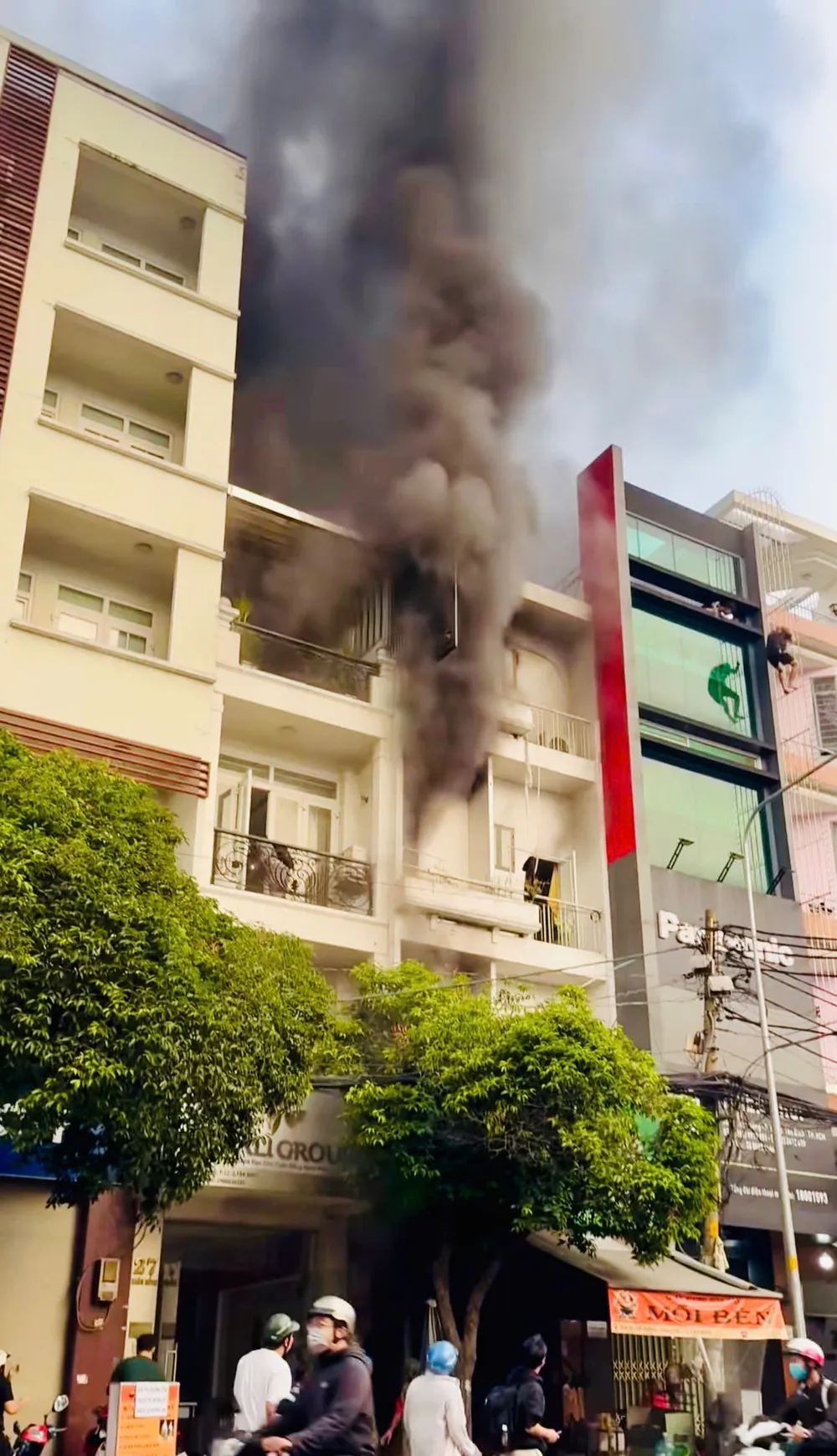 Do trong căn nhà chứa nhiều vật dụng dễ cháy nên ngọn lửa bùng phát dữ dội. Khói đen bao trùm lên toàn bộ căn nhà. Lúc này, nhiều người bên trong phải leo lan can qua nhà kế bên để thoát nạn.
