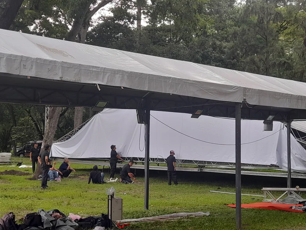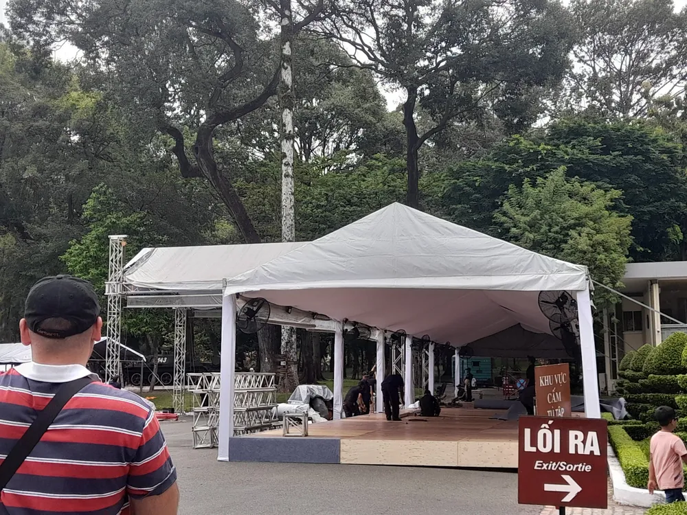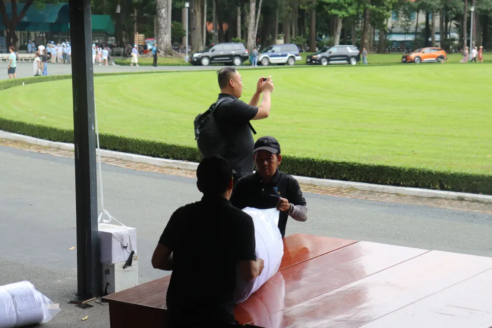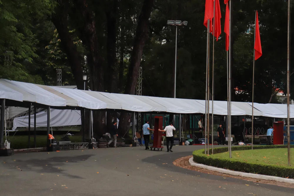 Theo ghi nhận của phóng viên Báo SGGP, chiều 23-7, tại Hội trường Thống Nhất, các nhân viên, công nhân khẩn trương dựng rạp bên ngoài hội trường.