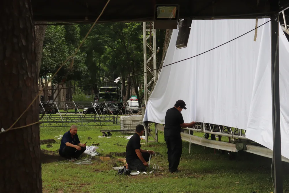 Nhân viên dựng rạp bên ngoài hội trường