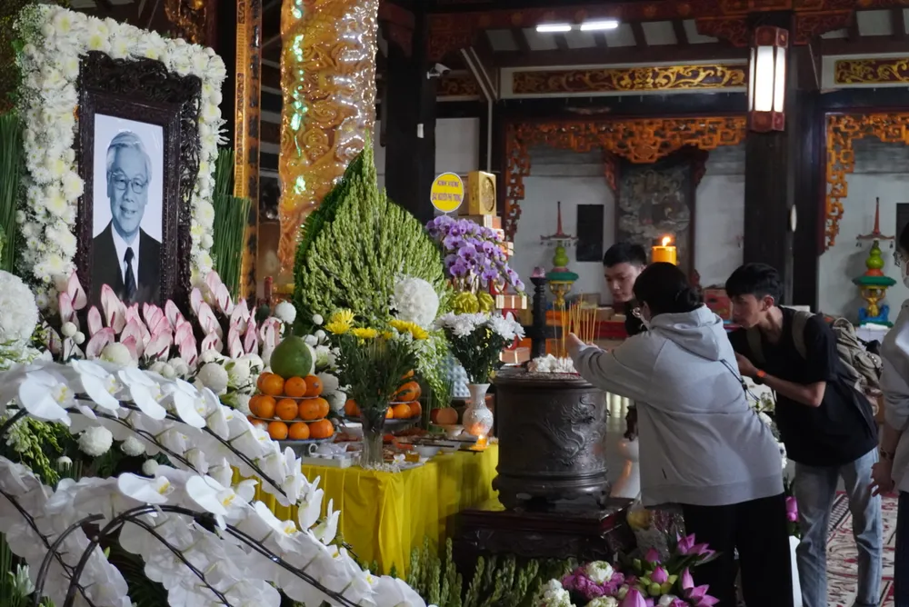 Người dân và cán bộ đoàn thanh niên đến thắp hương, tưởng nhớ Tổng Bí thư Nguyễn Phú Trọng