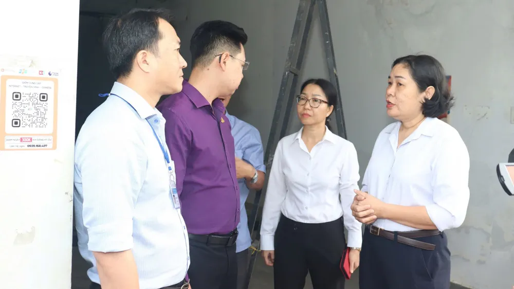 Bà Võ Thị Mỹ Ngọc, Phó Chủ tịch UBND quận 3 (ngoài cùng bên phải), vận động hộ gia đình cuối cùng di dời, bàn giao mặt bằng để triển khai dự án Metro số 2. Ảnh: THÀNH CHUNG