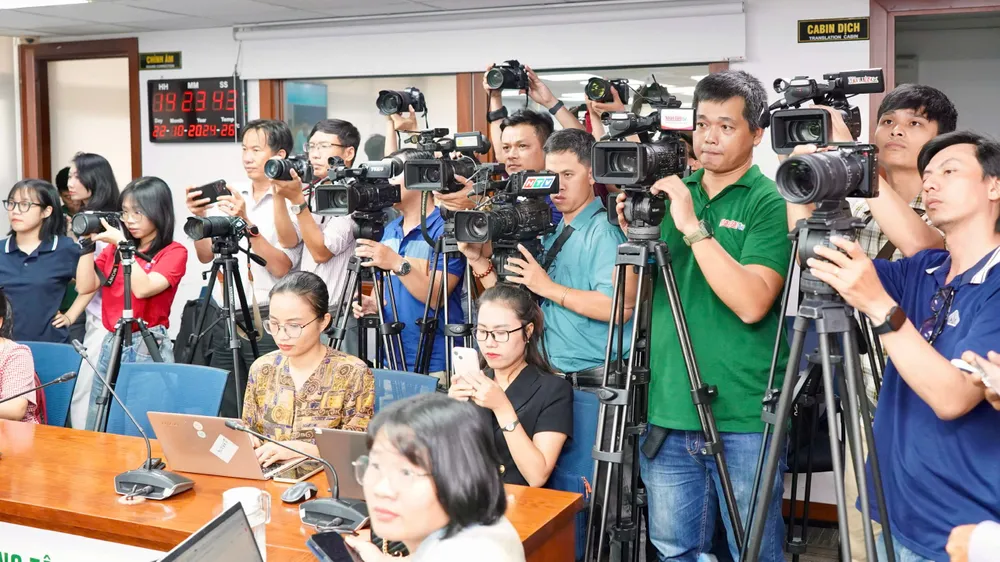 Đông đảo phóng viên, biên tập viên các cơ quan báo chí dự họp báo. Ảnh: HOÀNG HÙNG