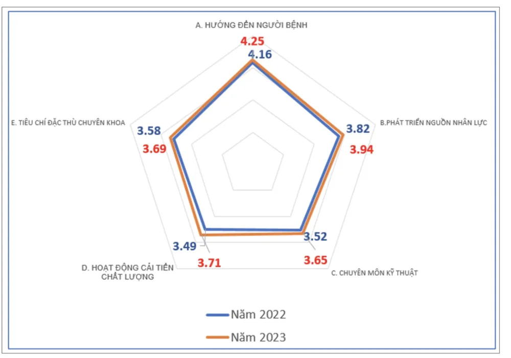 Chất lượng các bệnh viện trên địa bàn thành phố đã cải tiến ở tất cả các lĩnh vực từ năm 2022 đến năm 2023. Năm 2023, nhóm tiêu chí thuộc lĩnh vực Hướng đến người bệnh đạt điểm trung bình cao nhất (4,25/5), tăng 2,1% so với năm 2022. Tiếp theo là nhóm tiêu chí thuộc lĩnh vực Phát triển nguồn nhân lực bệnh viện có điểm trung bình đạt 3,94/5, tăng 3,1% so với năm 2022 (3,82). Nhóm tiêu chí thuộc lĩnh vực Hoạt động cải tiến chất lượng đạt điểm trung bình 3,71/5, tăng 6,3% so với 2022 (3,49). Nhóm tiêu chí thuộc lĩnh vực Đặc thù chuyên khoa (Sản, Nhi) đạt 3,69/5, tăng 3,1% so với 2022 (3,58). Nhóm tiêu chí thuộc lĩnh vực Hoạt động chuyên môn đạt điểm trung bình thấp nhất (3,65/5) tăng 3,7% so với năm 2022 (3,52).