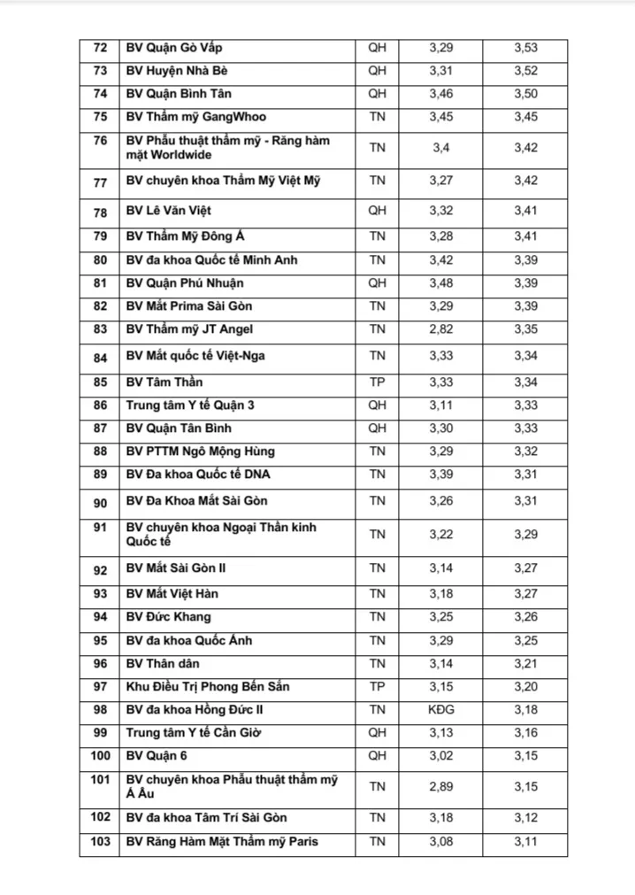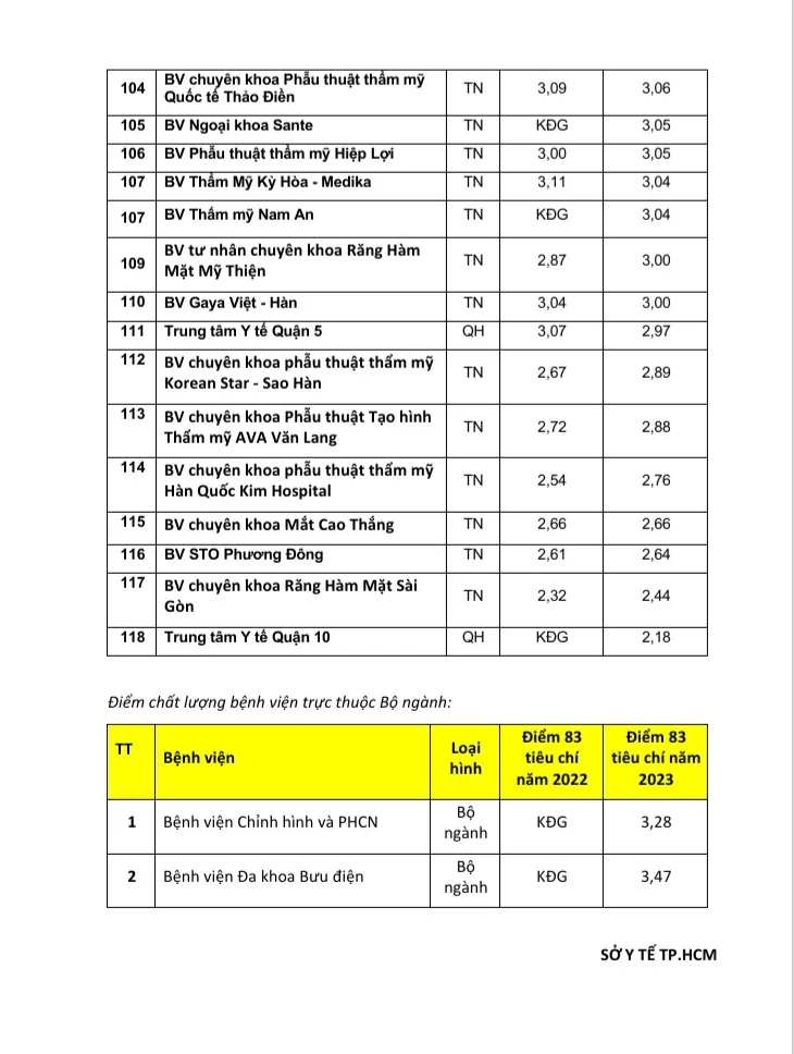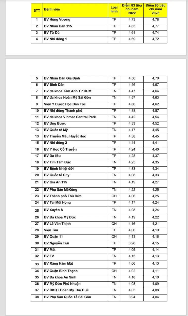 Có 41/120 (34,2%) bệnh viện có điểm chất lượng đạt từ 4,0 trở lên, 71/120 (59,2%) bệnh viện có điểm chất lượng từ 3.0 – 4.0, còn lại 8/120 (6,7%) bệnh viện có điểm từ 2.0 - 3.0. 5 bệnh viện dẫn đầu bảng xếp hạng điểm chất lượng bệnh viện năm 2023 gồm 2 bệnh viện chuyên khoa Sản (Bệnh viện Hùng Vương, Từ Dũ), 2 bệnh viện đa khoa (Bệnh viện Nhân dân 115, Nhân dân Gia Định) và 1 bệnh viện chuyên Khoa Nhi (Bệnh viện Nhi đồng 1).