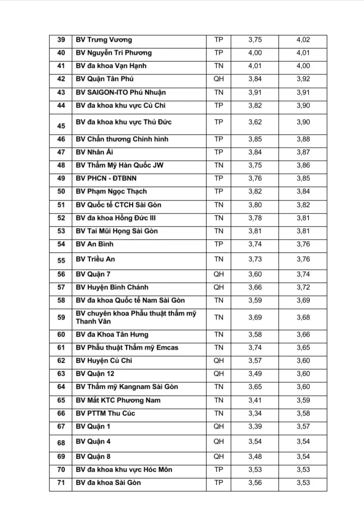 Theo PGS-TS Tăng Chí Thượng, Giám đốc Sở Y tế TPHCM, nhìn chung kết quả kiểm tra, đánh giá chất lượng bệnh viện năm 2023 có nhiều cải tiến. Có 12 bệnh viện đạt điểm trung bình trên 4,5 (trên thang điểm 5,0) tăng 38% so với năm 2022, 29 bệnh viện đạt điểm trung bình từ 4 – 4,5 và có 8 bệnh viện đạt điểm trung bình dưới 3, giảm 11% so với năm 2022. Nhóm bệnh viện tư nhân có điểm trung bình tăng 1,1% so với năm 2022, nhóm bệnh viện thành phố tăng 2,4% so với năm 2022 và nhóm bệnh viện quận, huyện tăng 0,9% so với năm 2022.