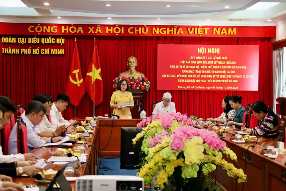 Sáng 9-10, Đoàn ĐBQH TPHCM tổ chức lấy ý kiến góp ý các dự thảo luật: Luật Xây dựng (sửa đổi); Luật Quy hoạch (sửa đổi); Nghị quyết về quy định một số cơ chế, chính sách tháo gỡ khó khăn, vướng mắc trong tổ chức thi hành Luật Đất đai; các đề xuất kiến nghị sửa đổi bổ sung Nghị quyết 98 Quốc hội về thí điểm một số cơ chế, chính sách đặc thù phát triển TPHCM.