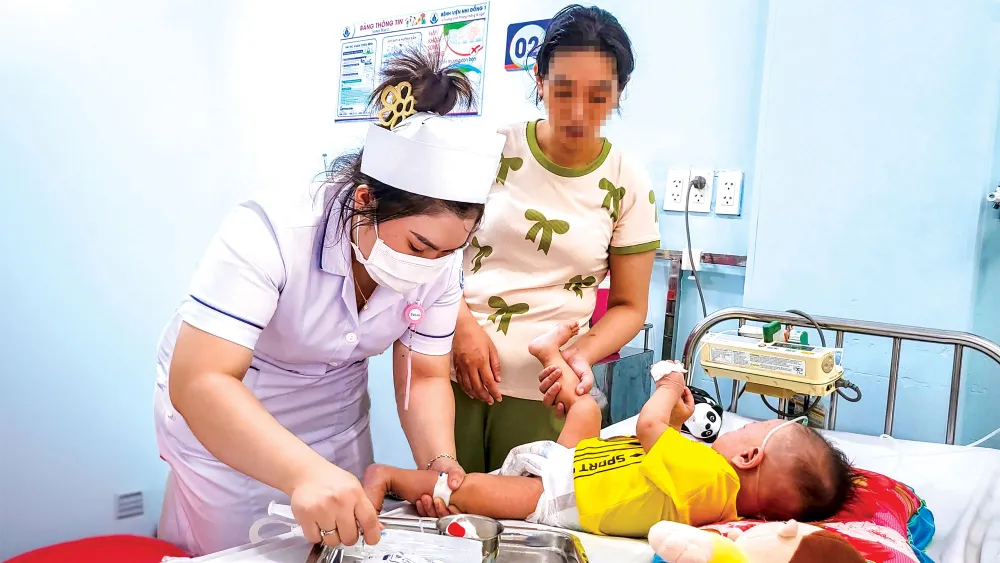 Nhân viên y tế Bệnh viện Nhi đồng 1 TPHCM tiêm vaccine sởi cho bệnh nhi. Ảnh: GIAO LINH