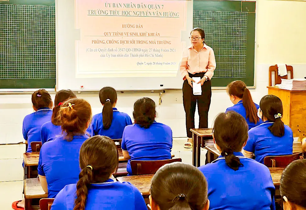 Giáo viên Trường Tiểu học Nguyễn Văn Hưởng (quận 7, TPHCM) được cán bộ y tế tập huấn về công tác phòng chống sởi vào ngày 28-8. Ảnh: QUANG HUY