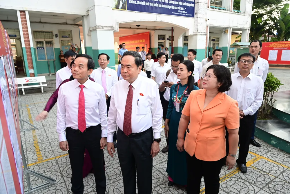Chủ tịch Quốc hội Trần Thanh Mẫn và Bí thư Thành ủy TPHCM Trần Lưu Quang đến dự lễ khai mạc Ngày bầu cử ĐBQH khóa XVI và đại biểu HĐND các cấp nhiệm kỳ 2026-2031 tại Khu vực bỏ phiếu số 14 (Trường THCS Đỗ Văn Dậy, xã Hóc Môn, TPHCM). Ảnh: VĂN MINH