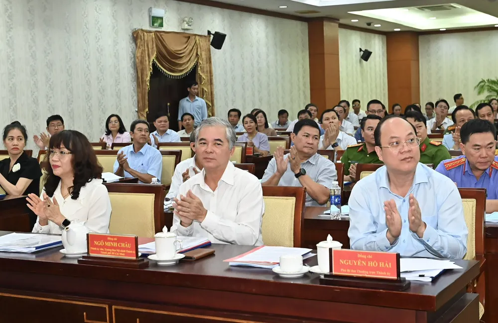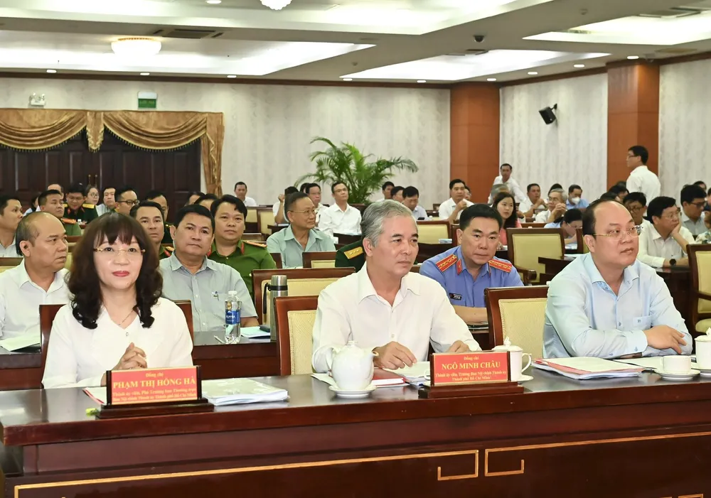 Phó Bí thư Thường trực Thành ủy TPHCM Nguyễn Hồ Hải cùng các đại biểu dự hội nghị. Ảnh: VIỆT DŨNG