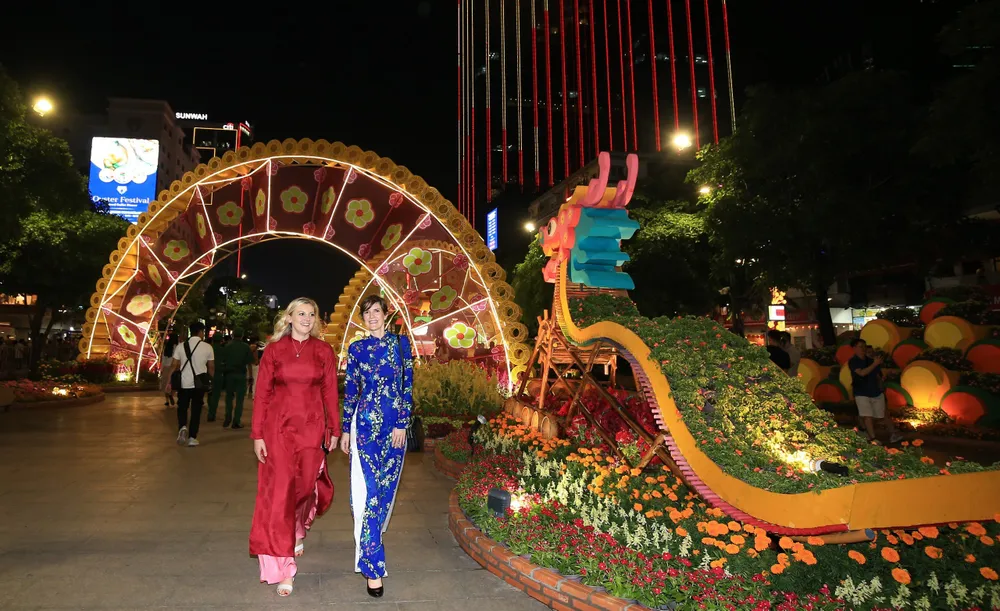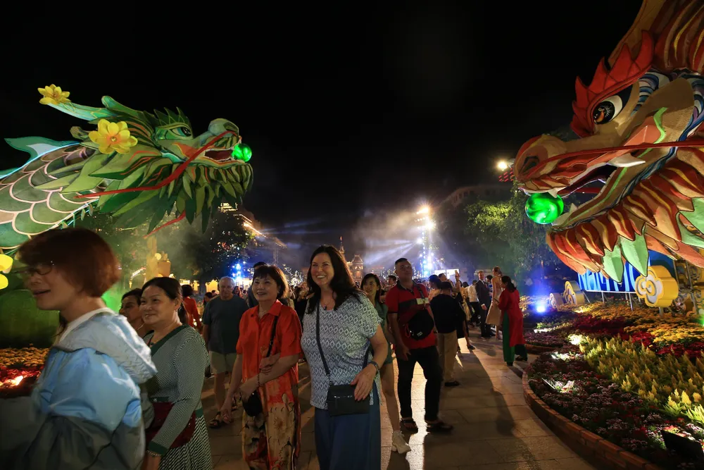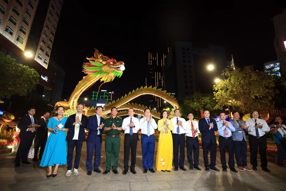 Ngay sau lễ cắt băng khai mạc, đoàn đại biểu đã cùng tham quan Đường hoa Nguyễn Huệ với nhiều cảm xúc tươi vui, tinh thần phấn chấn, hòa cùng bao niềm vui tươi rạng rỡ của sắc hoa xuân, cảnh trí đẹp, linh vật rồng hoành tráng, quy mô, sắc sảo, ấn tượng.