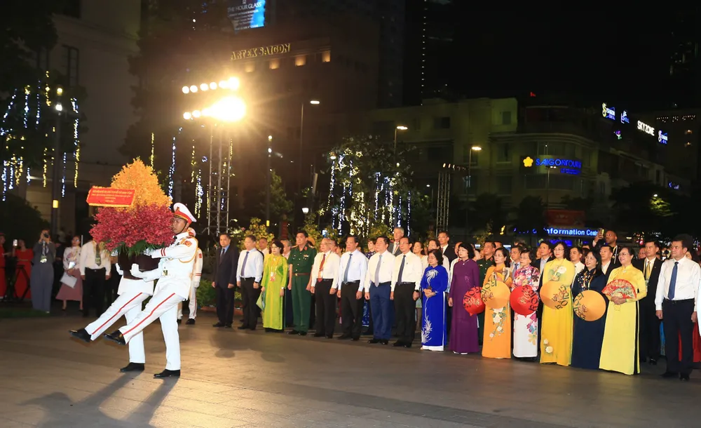 Trước giờ khai mạc Đường hoa, Đồng chí Nguyễn Văn Nên, Ủy viên Bộ Chính trị, Bí thư Thành ủy TPHCM cùng các đại biểu dâng hoa Chủ tịch Hồ Chí Minh. Ảnh: DŨNG PHƯƠNG