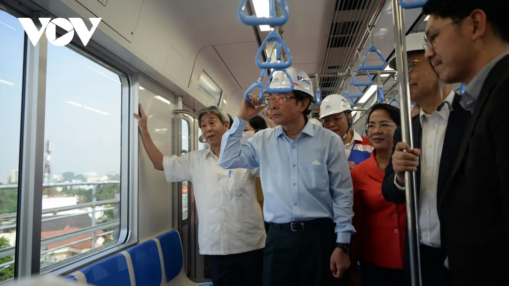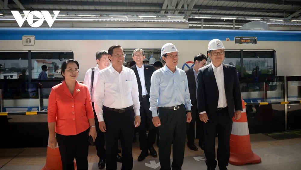 Bí thư Thành ủy Nguyễn Văn Nên cùng Chủ tịch UBND TPHCM Phan Văn Mãi cùng các quan chức Nhật Bản Nhật Bản thử tàu metro 1 hồi tháng 12/2023