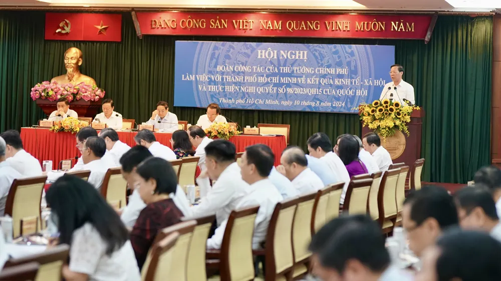 Sáng 10-8, đoàn công tác của Thủ tướng Chính phủ làm việc với TPHCM về kết quả kinh tế - xã hội và thực hiện Nghị quyết số 98/2023/QH15 của Quốc hội về thí điểm một số cơ chế, chính sách đặc thù phát triển TPHCM (Nghị quyết 98).