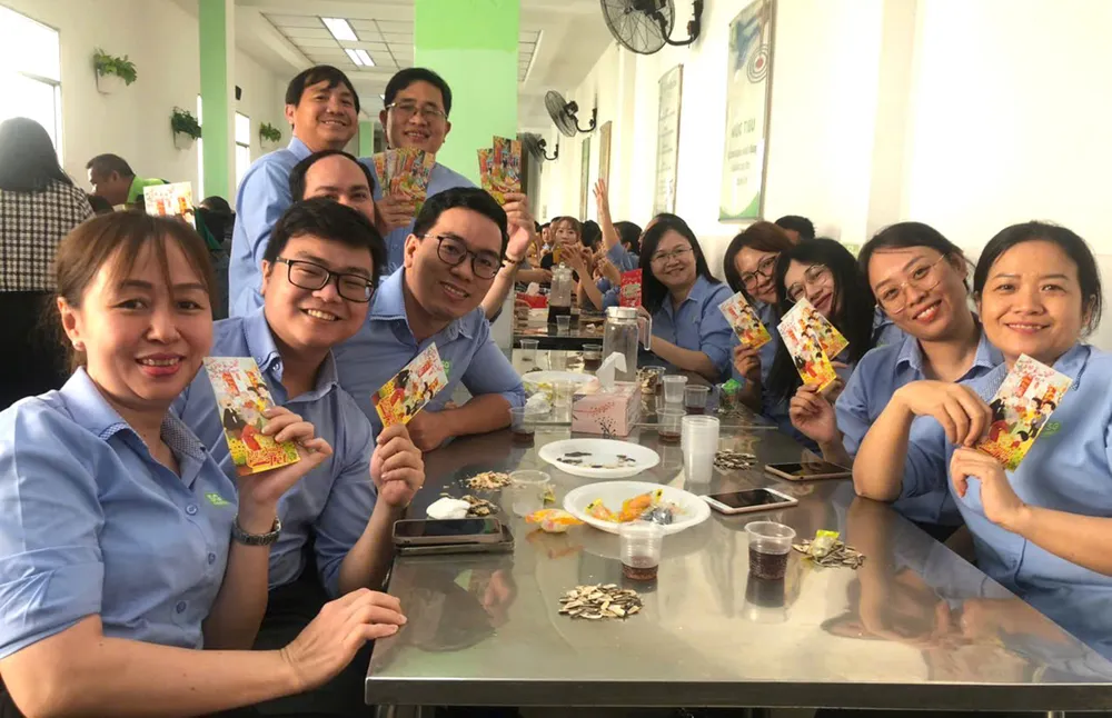 Người lao động Công ty CP Sài Gòn Food (KCN Vĩnh Lộc, huyện Bình Chánh, TPHCM) phấn khởi nhận lì xì trong ngày làm việc đầu năm mới