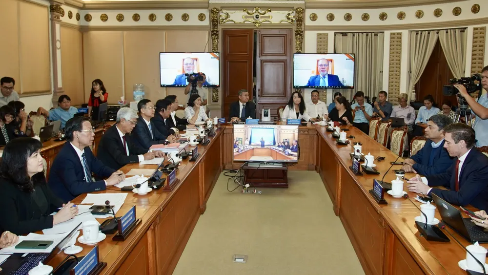 Lãnh đạo TPHCM trao đổi với các đại diện Ngân hàng thế giới. Ông Chandra Sinha, Trưởng thị trường tài chính carbon toàn cầu - Ngân hàng thế giới dự trực tuyến. Ảnh: HOÀNG HÙNG