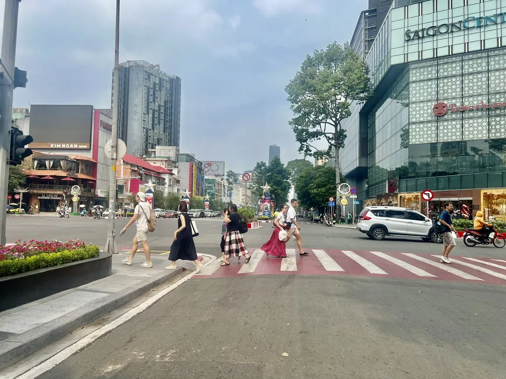 Du khách quốc tế dạo chơi trên đường Lê Lợi. Ảnh: QUỐC HÙNG