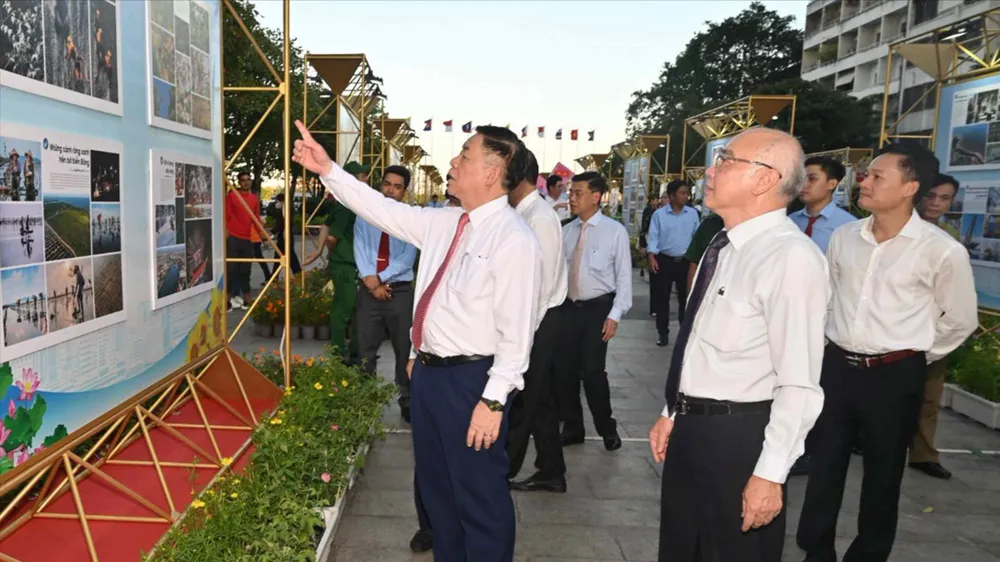 Các đại biểu tham quan triển lãm ảnh “TPHCM cùng cả nước, vì cả nước” do Ban Tuyên giáo Trung ương, Thành ủy TPHCM và Hội Nghệ sĩ Nhiếp ảnh Việt Nam tổ chức tại TPHCM ngày 25-4. Ảnh: DŨNG PHƯƠNG