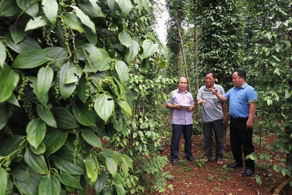 Cán bộ kỹ thuật hướng dẫn quy trình canh tác hồ tiêu theo hướng công nghệ cao, tại hộ dân ở xã Bình Giã, TPHCM