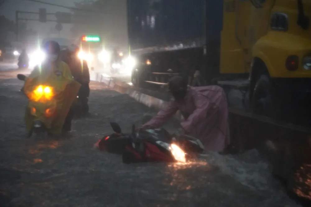 Mưa lớn, ngập nặng, nhiều người đi xe máy bị té ngã