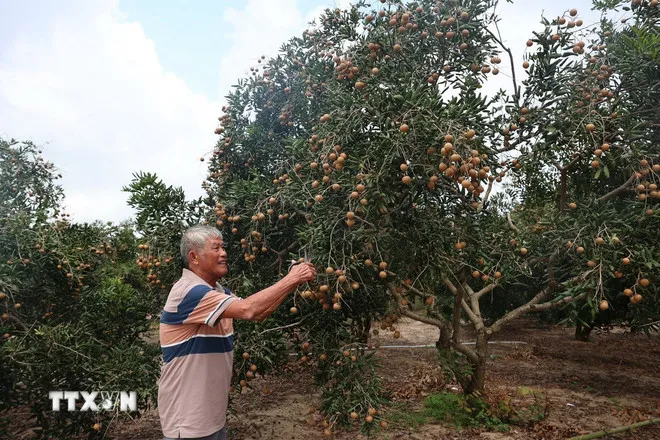 Vườn nhãn của gia đình ông Phạm Thẩm, ấp An Điền, xã Phước Hải, Thành phố Hồ Chí Minh dự kiến thu hoạch được 60 tấn. (Ảnh: Hoàng Nhị/TTXVN)