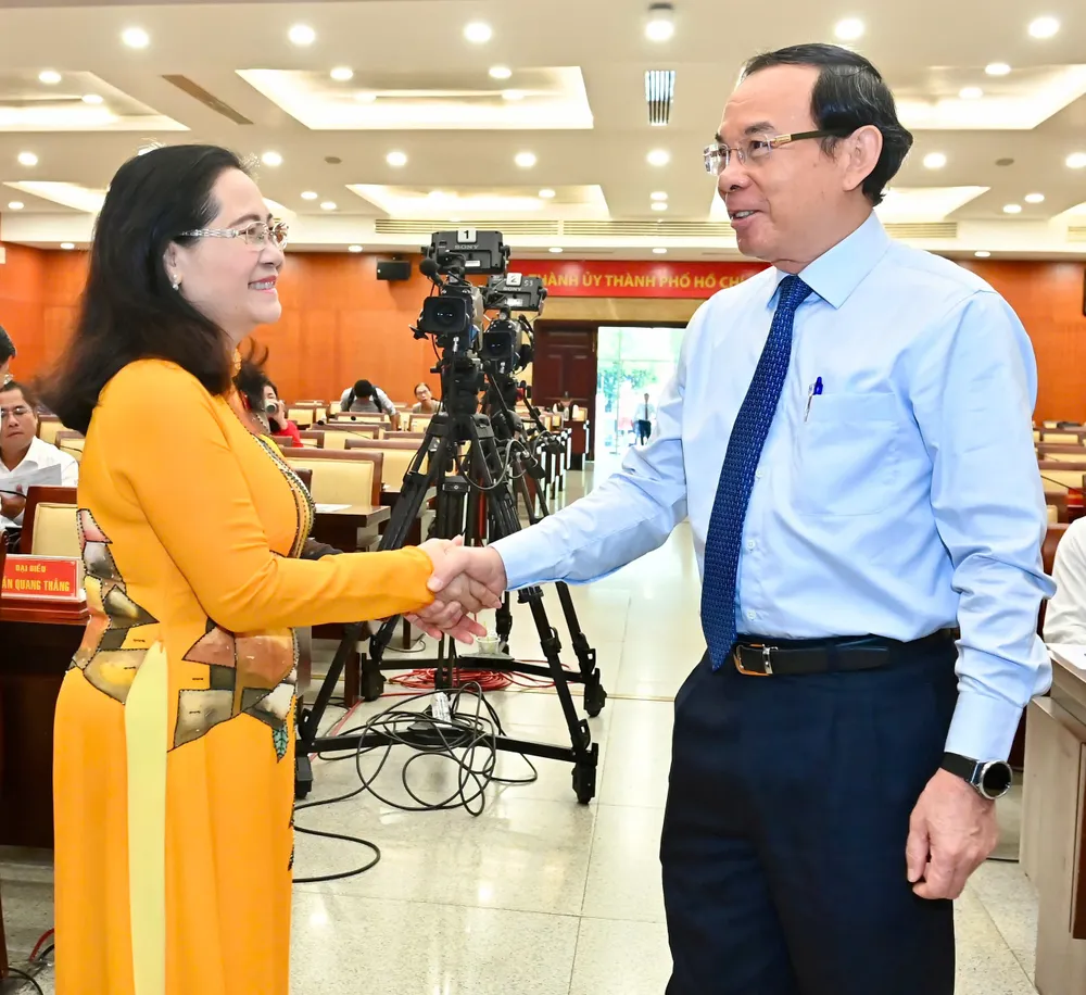 Bí thư Thành ủy TPHCM Nguyễn Văn Nên trao đổi cùng Chủ tịch HĐND TPHCM Nguyễn Thị Lệ. Ảnh: VIỆT DŨNG