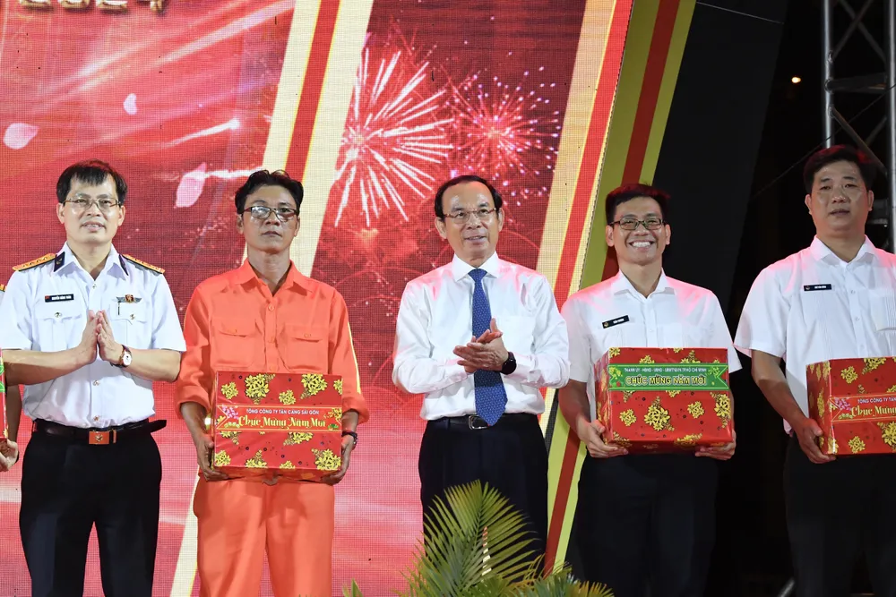 Chủ tịch UBND TPHCM Phan Văn Mãi tặng quà cán bộ, chiến sĩ, người lao động trong chương trình phát lệnh làm hàng đầu xuân của Tổng Công ty Tân cảng Sài Gòn. Ảnh: VIỆT DŨNG