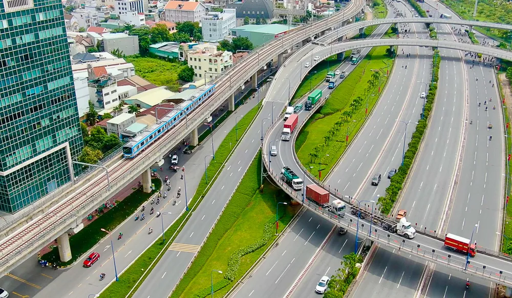 Tàu metro Bến Thành - Suối Tiên di chuyển tại ngã ba Cát Lái. Ảnh: HOÀNG HÙNG