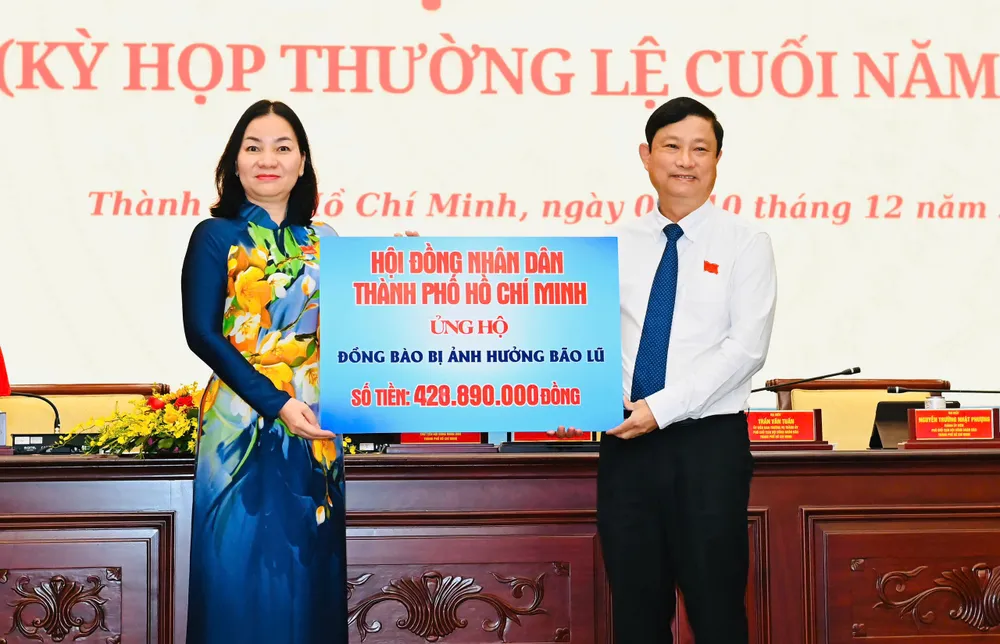 Chủ tịch HĐND TPHCM Võ Văn Minh trao tặng tiền ủng hộ đồng bào bị thiệt hại do bão lũ đến Uỷ ban MTTQ Việt Nam TPHCM. Ảnh: VIỆT DŨNG