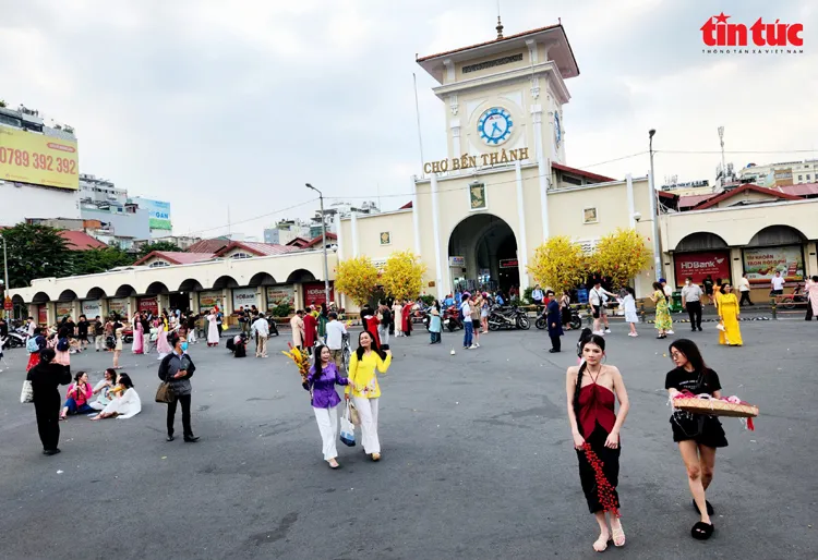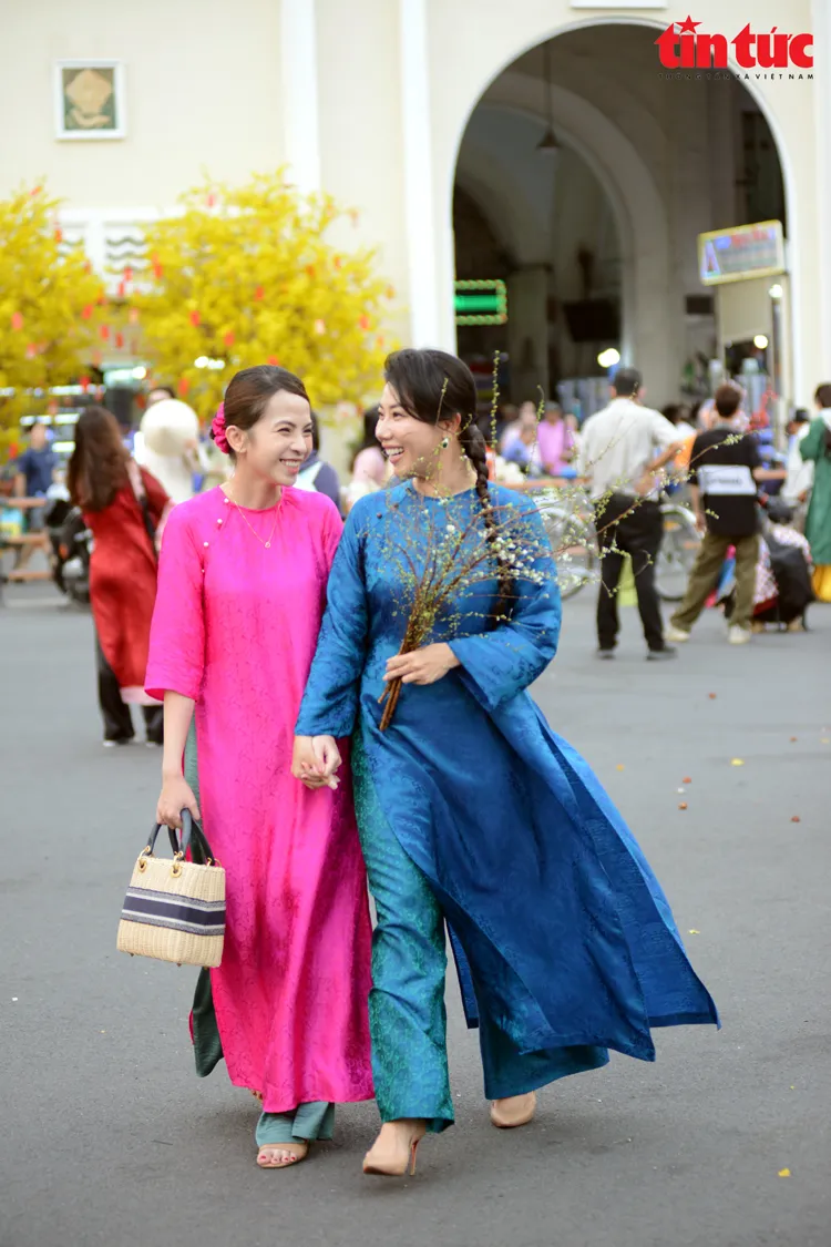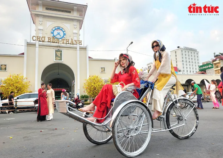 Mang nét hoài cổ đặc trưng của Sài Gòn xưa, chợ Bến Thành được nhiều cô gái lựa chọn làm bối cảnh cho những tấm ảnh chụp áo dài mang hơi hướng cổ điển. Nhiều nhóm bạn trẻ tạo dáng với xích lô để chụp ảnh áo dài Tết trước cổng chợ.