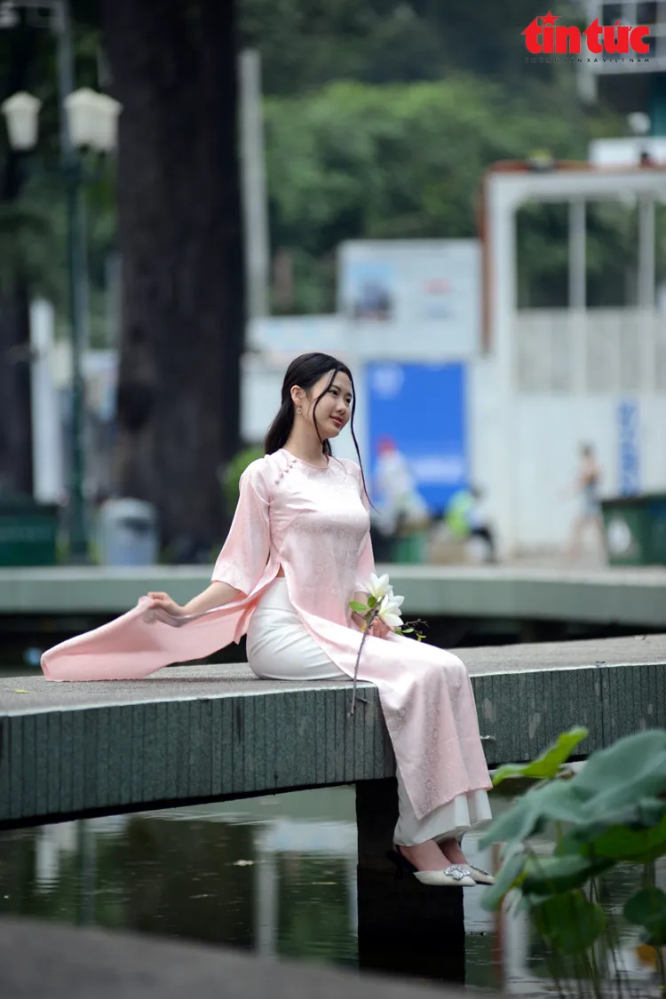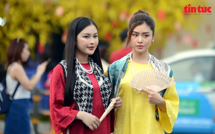 Sự xuất hiện của những tà áo dài trên các điểm du lịch khiến người đi đường chộn rộn Tết đang về.