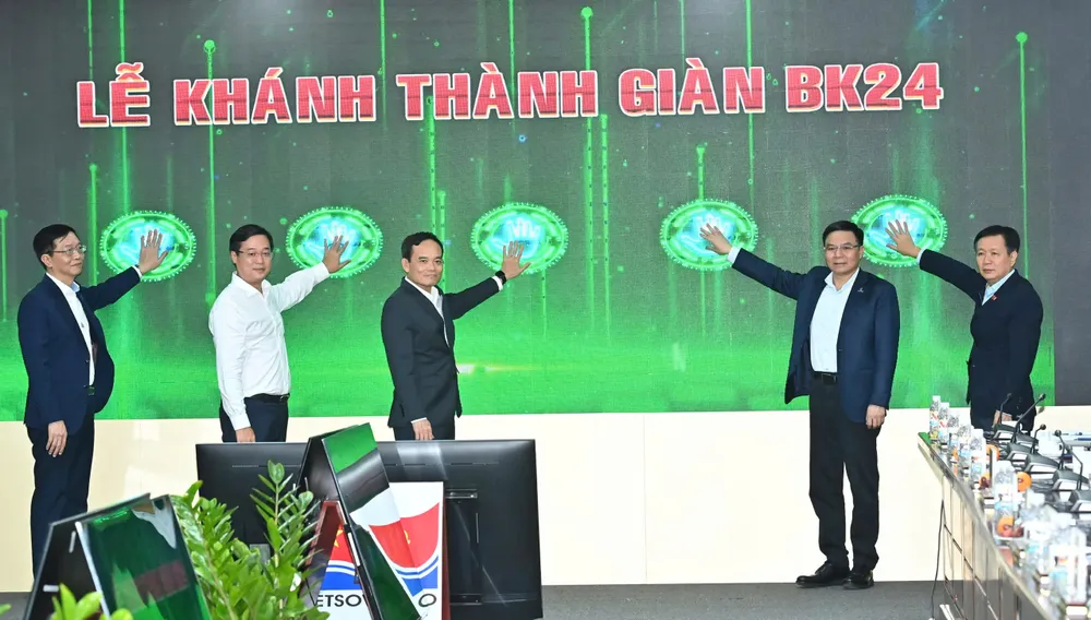 Bí thư Thành ủy TPHCM Trần Lưu Quang cùng các đồng chí lãnh đạo TPHCM và tập đoàn bấm nút khánh thành Giàn BK24. Ảnh: VIỆT DŨNG
