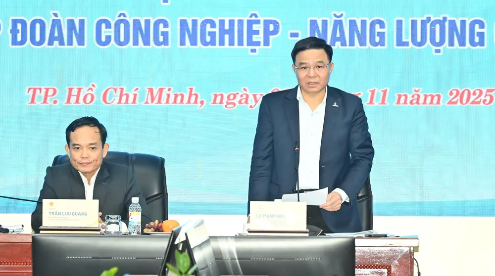 Bí thư Đảng ủy, Chủ tịch Hội đồng Thành viên tập đoàn Lê Mạnh Hùng phát biểu. Ảnh: VIỆT DŨNG