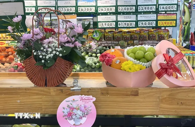Combo hoa-trái cây là món quà thiết thực trong dịp 20-10. (Ảnh: Hương Giang/ TTXVN)
