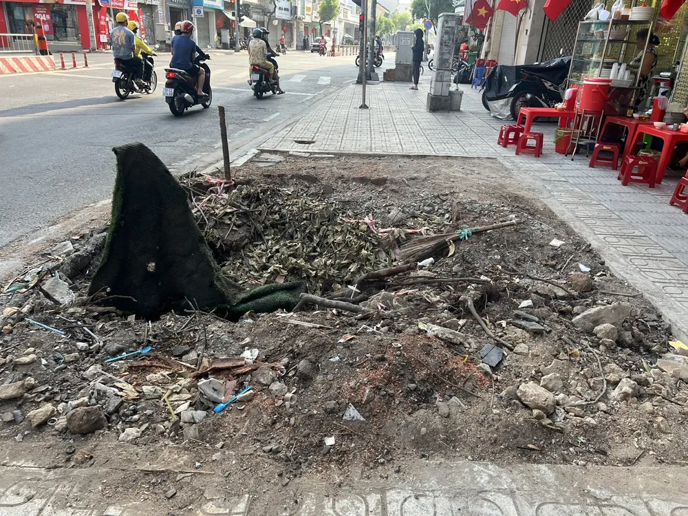Hàng loạt cây xanh cổ thụ trên đường Trần Hưng Đạo đã bị đốn hạ chỉ còn lại hố sâu. Ảnh: QUỐC HÙNG
