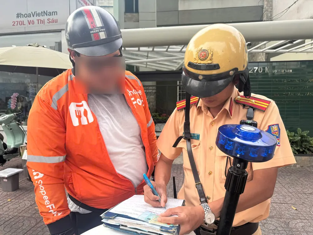 Nam shipper bị CSGT xử phạt vì lỗi chạy xe gắn máy trên vỉa hè ở quận 3. Ảnh: CHÍ THẠCH