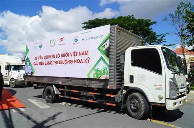 Xe vận chuyển lô bưởi đầu tiên xuất khẩu sang Hoa Kỳ. (Ảnh: Công Trí/TTXVN)