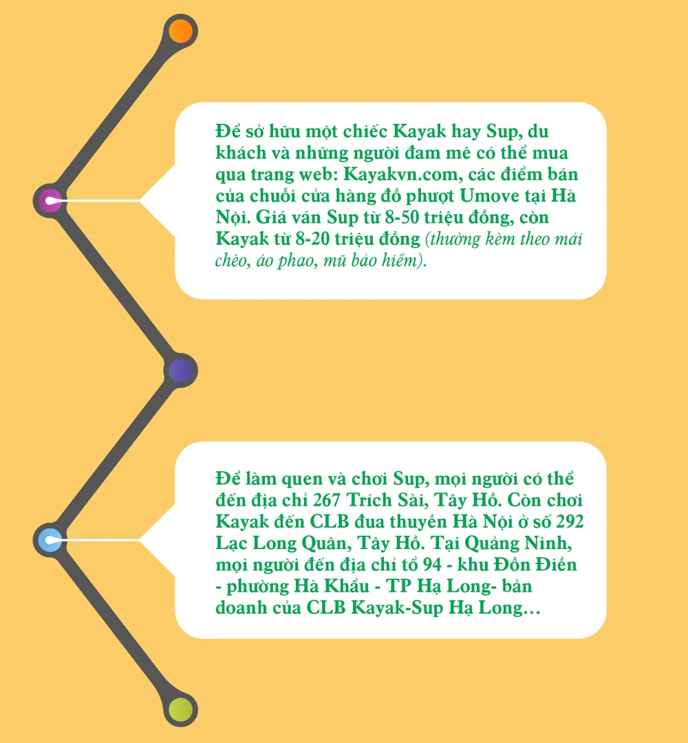 Hiện nay CLB Kayak Hạ Long được xem là hoạt động quy củ và chuyên nghiệp nhất. CLB có gần 300 thành viên thường xuyên tham gia cùng một số người mới. Những người chơi ở CLB Hạ Long sẽ được trang bị thuyền, mái chèo, áo phao, mũ bảo hiểm miễn phí. Còn ở những nhóm, CLB khác người chơi sẽ phải tự trang bị Sup, mái chèo và trang phục, dụng cụ đi kèm. Ngoài ra, khách du lịch thích chèo ngẫu hứng khi đến vùng sông Quây Sơn (Cao Bằng), sông Nho Quế (Hà Giang), Vườn quốc gia Phong Nha-Kẻ Bàng (Quảng Bình)… cũng có thể thuê Kayak -Sup để chèo trải nghiệm sông nước.