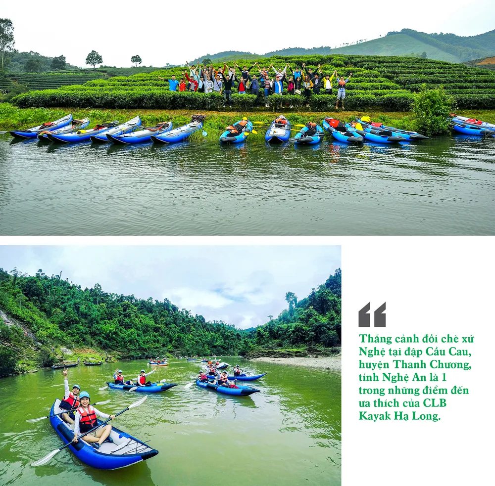Thắng cảnh đồi chè xứ Nghệ tại đập Cầu Cau, huyện Thanh Chương, tỉnh Nghệ An là 1 trong những điểm đến ưa thích của CLB Kayak Hạ Long. Những chiếc thuyền Kayak, ván Sup nhiều màu sắc chở được 1 đến 2 người chơi lướt nhẹ trên vùng nước trong veo, bên trên là khung cảnh đồi chè tròn trịa, như mâm xôi xanh mơn mởn.