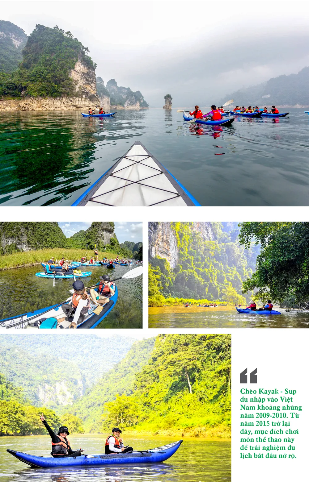 Chèo thuyền Kayak và ván Sup là môn thể thao dưới nước đã được nhiều vận động viên tập luyện, thi đấu từ lâu trên thế giới. Chèo Kayak-Sup cũng trở thành môn thể thao trải nghiệm du lịch tuyệt vời tại nhiều nơi. Ở Việt Nam, những hội nhóm, CLB Kayak-Sup đi trải nghiệm du lịch đã xuất hiện những năm gần đây. Nhiều người hào hứng chia sẻ về những trải nghiệm khi được tự tay chèo Kayak-Sup lang thang trên sông, hồ vùng Ba Bể (tỉnh Bắc Kạn) Lâm Bình, Na Hang (tỉnh Tuyên Quang), sông Nho Quế (tỉnh Hà Giang), sông Quây Sơn (tỉnh Cao Bằng), hay đồi chè xứ Nghệ… để ngắm non nước hữu tình.