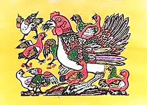 2.Tranh Gà thư hùng, gồm có con trống, con mái và đàn gà con quấn quít nhau với câu thơ chữ Nôm phụ họa trên tranh:No đủ vợ chồng, có đầu có mỏ/Lắm con nhiều cháu, giống cánh giống lông.